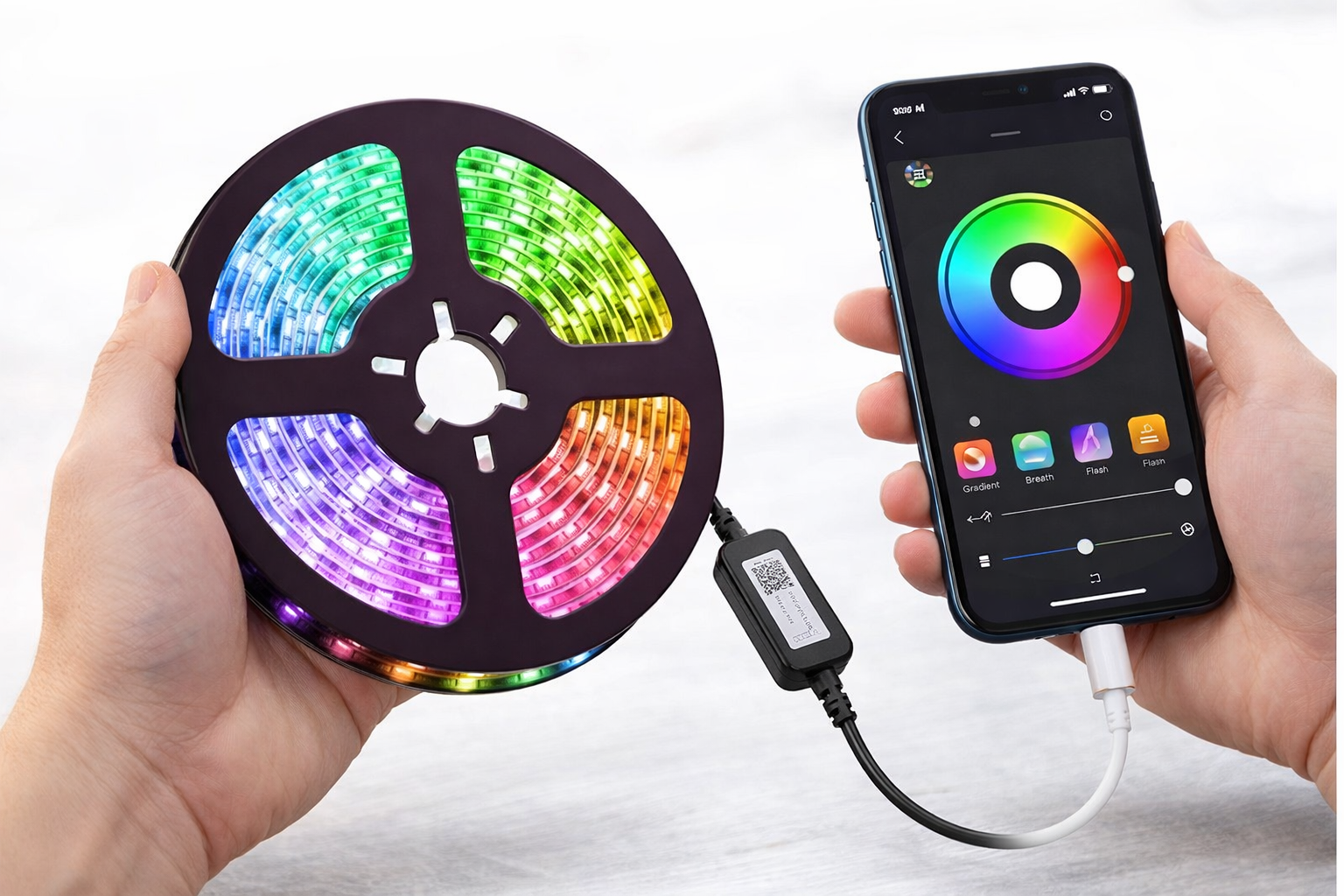Control colours, brightness and lighting modes directly from your smartphone.